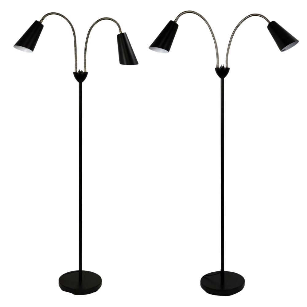 WALT is a mid-century styled twin floor lamp featuring flexible goose-neck arms with metal shades. WALT’s individual switches are located on the central hub, for easy access to operate each light separately. WALT is finished in matt black with antique brass or brushed chrome highlights. Shades have a white painted inner, providing better light reflection.